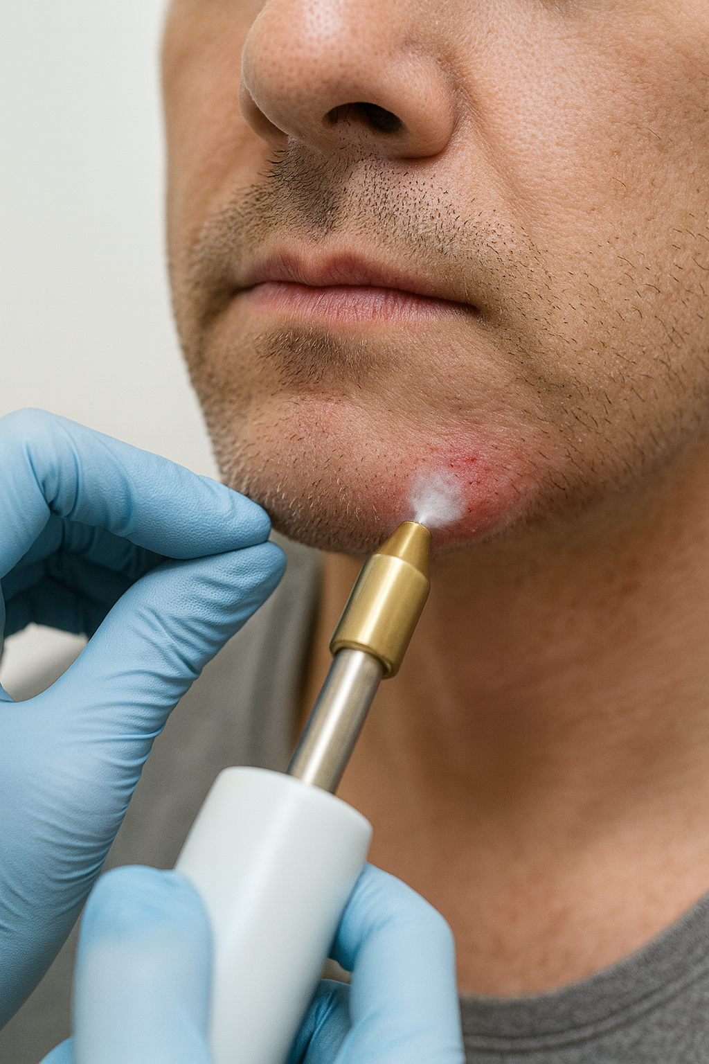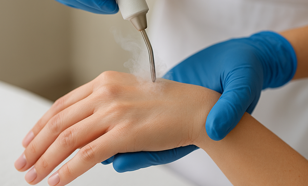 El procedimiento se realiza durante la consulta, sin necesidad de preparación especial ni anestesia. Consiste en aplicar nitrógeno líquido sobre la lesión con una pequeña sonda o spray, provocando una congelación local controlada.
